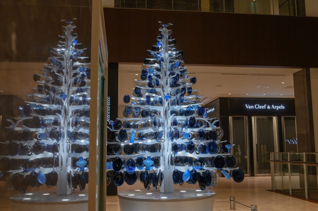 本件は、名古屋市内において著名なギャラリーである「Gallery Nao Masaki」からの依頼であり、作品を制作するアーティストは金沢を拠点に活躍するガラス作家の辻和美氏。空間ディレクターは「Gallery Nao Masaki」の正木なお氏です。設置されたのは名古屋駅前のミッドランドスクエアで、期間は2020年のクリスマスイベント期間中でした。アイチ金属は、ツリーの支柱の製作と、枝、鉢部分の溶接と塗装を手掛けました。今回製作したのは、400枚ものガラスのお皿が吊り下げられたクリスマスツリーの木の部分です。お皿だけで合計すると1tほどの重量となります。これを、しっかり支えられる強度が幹の部分になければそもそもこの作品が成立しません。一方で、無骨な仕上げになってしまえば、アートワーク全体の完成度が下がります。 アートピース製作に触れて理解できたことは、まずアートに関わる方々は「機能的にも優れている」ということを具現化する発想と経験を持っているということです。これは、我々が日常的に触れてきたものであり相性は抜群でした。幹の仕上げはホワイトカラーであり、表面の美しさを保つために溶射の技術を用いています。別の企業が部材製作を実施した枝部分との最後の組み合わせは、現場での仕上げになります。通常の現場と同じく、現場取付 / 施工部のスタッフが一つずつ組み上げて完成となりました。