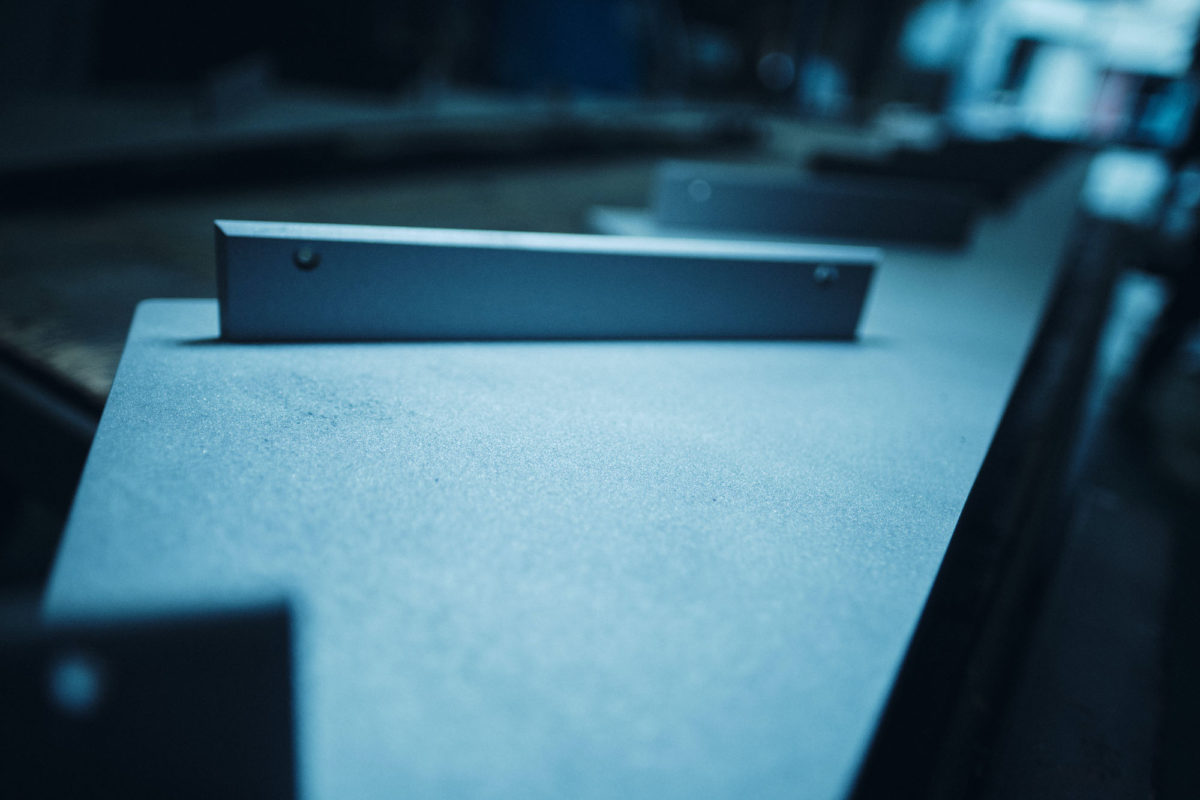 わたしたちの塗装には溶射の技術を応用しています。これによって鉄材の防蝕するとともに表面に凹凸を作り出し、そこに塗装を行うことで塗膜の剥がれを防ぐことが目的です。また、独特の風合いが出てくることから、すでにわたしたちの基礎技術のひとつとなっています。しかし、あくまでこれは下地としてのお話し。そこで、さらに一歩進み、溶射した下地そのものに加飾処理を実現し、「仕上げた部材」としても活用できないか模索し続けてきました。というのも、溶射特有の梨地にはなんとも言えない味わいがあり、この仕上げを好むクライアントも多かったためです。しかし皮肉なことに、それらの開発自体を阻んできたのもまたこの梨地であるのです。 そこで我々は、処理剤を片っ端から試しつつ、加飾処理を行えないかと試してきました。結果、溶射素材を黒い仕上げに変換させる手法を編み出しました。これによって、明るいシルバーであった溶射後の素材の表面処理として、黒皮のような色味を実現することができます。