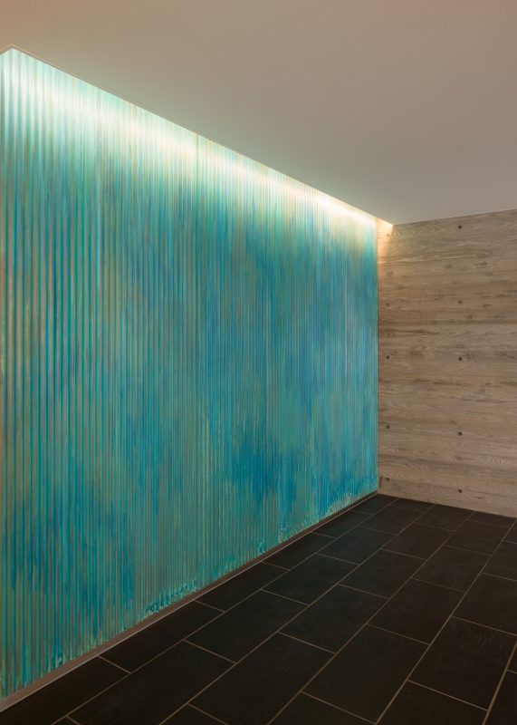 当案件では、エントランスの巨大なパーテーション部分の製作でした。トタン素材にVerometal® Copperを用いてコーティングした上で、緑青を生じさせる加飾処理を行なったアートウォールです。同じ仕上がり部材をインターホンの操作部分に用いており、建物内に軽快な印象を与えています。金属の存在感はそのままに、美しい緑青の色味がダイナミックに楽しめます。さらにインターホン前の手すりには、内側のみVerometal® Copperコーティングし緑青を生じさせました。じっくりと深い飴色になる銅の表情も楽しめます。 Verometal®を使用することで大面積でも安定した品質で提供することができます。むろん、均一な仕上がりと、丁寧な加飾処理を大面積で実現するのは熟練の技が必要です。少しでも塗りムラが生じると、均一な緑青の生成となりません。大面積になればなるほどVeroMetall®コーティングや加飾の技術が必要であり、逆に言うなば、"意図的なムラ"を作りたいのであれば、全体をコントロールし切る技術が必要なのです。