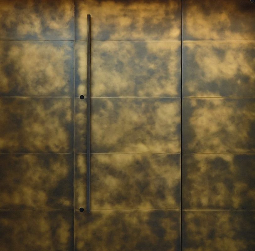 こちらは、年月が経って経年変化した真鍮の一枚板に「黒」を表現したタイプです。同時に、真鍮特有のゴールド感も演出しています。こうした加飾がもたらす重厚感、高級感が演出する感覚は唯一無二のものです。 特に我々のところに来るオーダーは玄関扉や、商業施設の扉であることが多いかもしれません。お客様をお迎えするだけではなく、自らがその扉を開ける時に得られる圧倒的な充足感もまた、お客様から魅力であると評価をいただいています。ここにも「黒」の魅力が生きています。「黒」の可能性を開くことは、私たちにとって新しいメタルの扉を開くことでもあるのです。